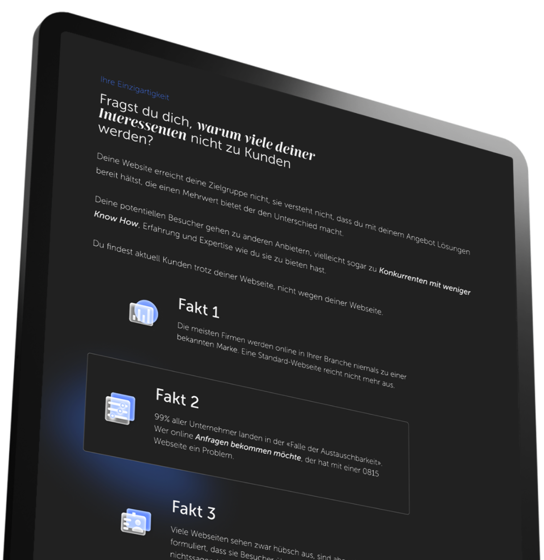 99% aller Unternehmer landen in der «Falle der Austauschbarkeit». Wer online Anfragen bekommen möchte, der hat mit einer 0815 Webseite ein Problem.