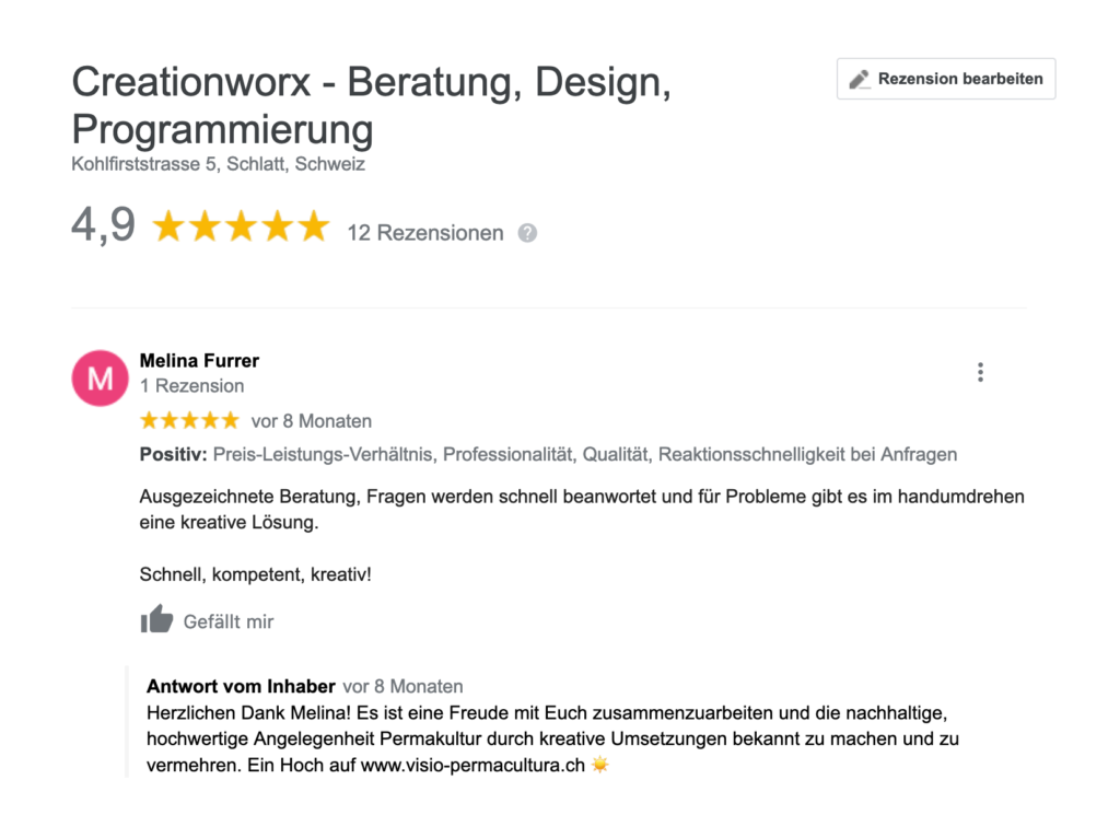 Wenn dich die Kommentare der Google-Bewertung überzeugt haben, hast du auch die Möglichkeit die Digital Design-Agentur in Schaffhausen um eine Auswahl an Referenzen zu bitten, die du dir in aller Ruhe als nächsten Schritt ansehen kannst. Wie wurde für andere Unternehmen der Webauftritt umgesetzt? Wie facettenreich ist das Webdesign? Überzeugt dich die Arbeit des Grafik-Studios? Findest du die Referenzen individuell und hochwertig, exklusiv und anspruchsvoll?