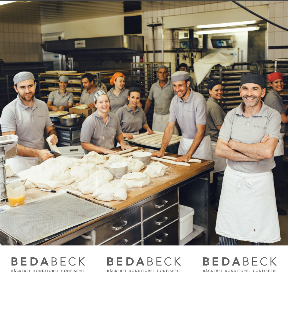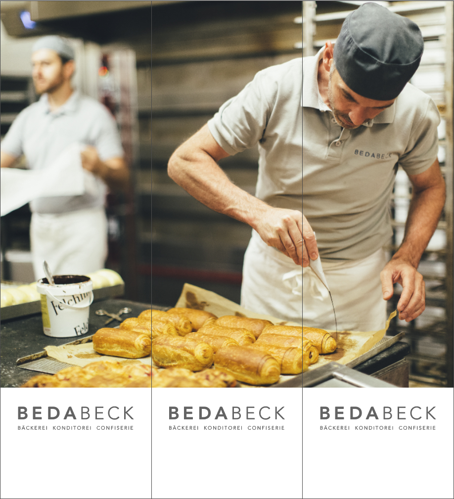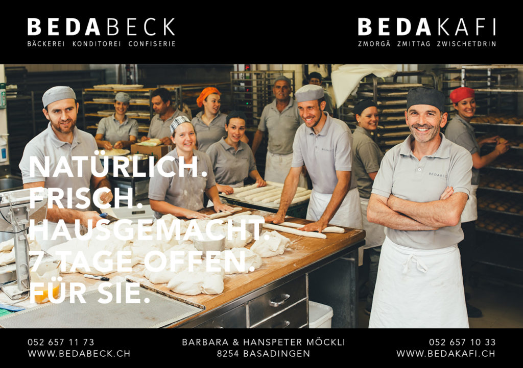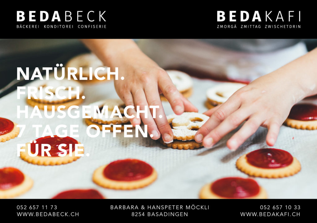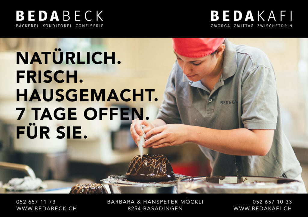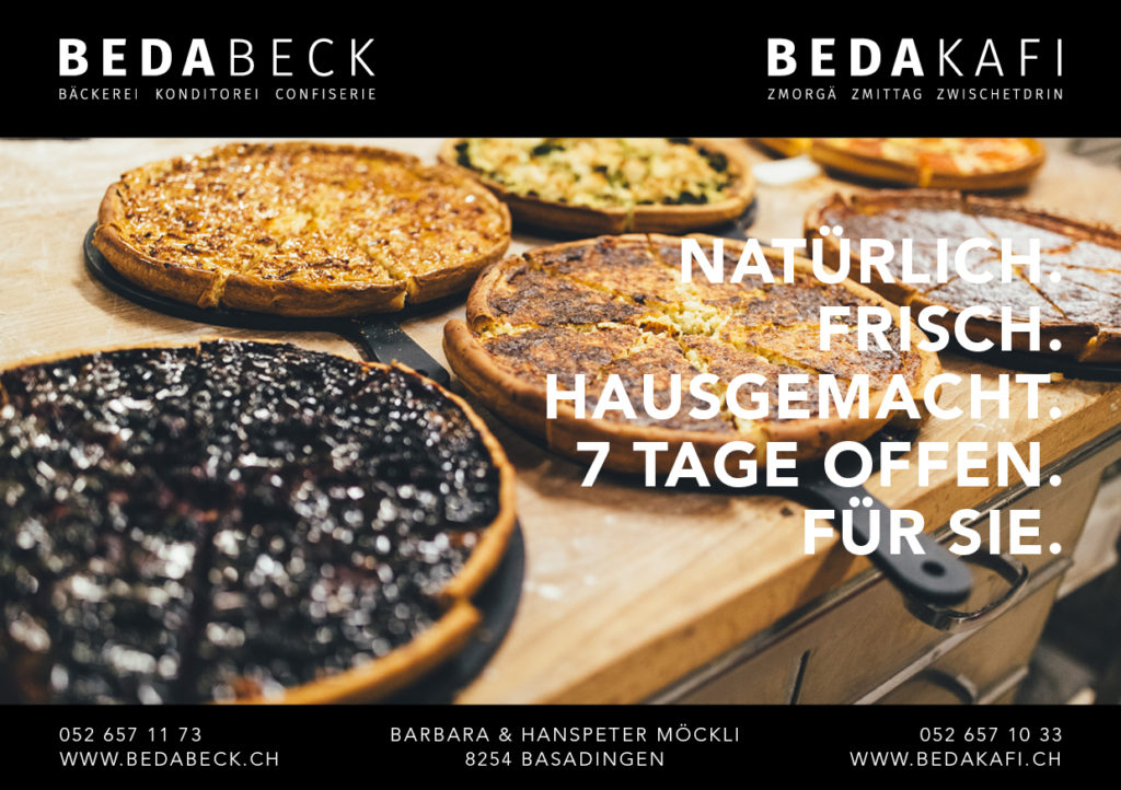 Basierend auf der neuen Bildwelt und dem modernen Schriftbild entstand ein visuell starkes Fundament für vielfältige Anwendungen. Gestaltet wurden Fassadenbanner, Inserate und Etiketten – alle mit dem Ziel, die Marke BEDA BECK visuell zu stärken und ihren unverwechselbaren Charakter zu transportieren.