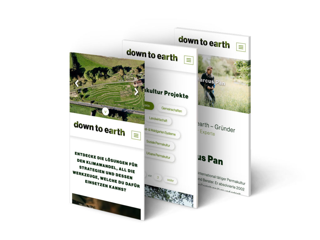 Für down to earth entstand ein modernes Brand Design mit klarer, reduzierter Gestaltung, kombiniert mit Webdesign, Seminarbuchungssystem, E-Commerce-Lösung, Fotografie und individuell gestalteten Printmedien. Der Auftritt vermittelt authentisch die Werte der Permakultur und unterstützt die Lehr- und Vermittlungsarbeit der Akademie.
