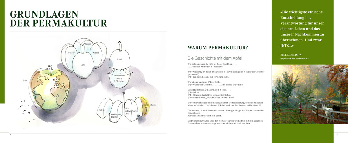 Für die Permakultur Akademie gestalteten wir ein 104-seitiges Handbuch für den Permaculture Design Course (PDC). Alle Grafiken, Illustrationen und das gesamte Layout wurden individuell und handgemacht umgesetzt. Das Handbuch dient den Studierenden als Lern- und Arbeitsmaterial während der intensiven zweiwöchigen Kurse, die direkt im Freiluftklassenzimmer stattfinden. Ziel war es, visuell und inhaltlich ein kohärentes, praxisnahes und hochwertiges Material zu schaffen.