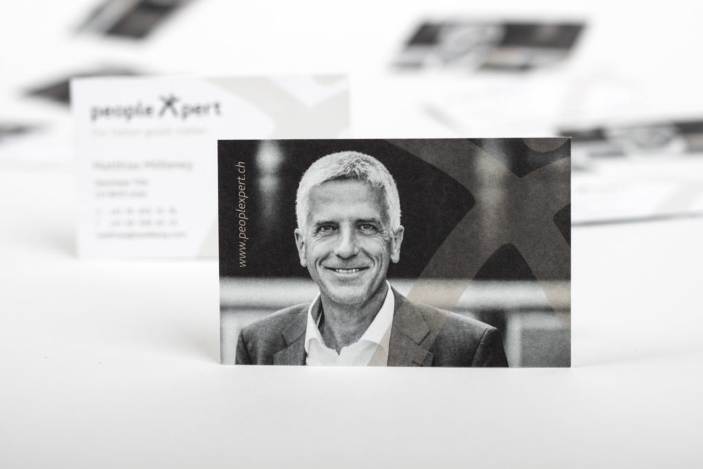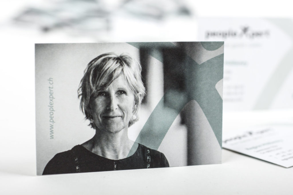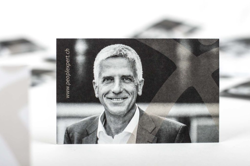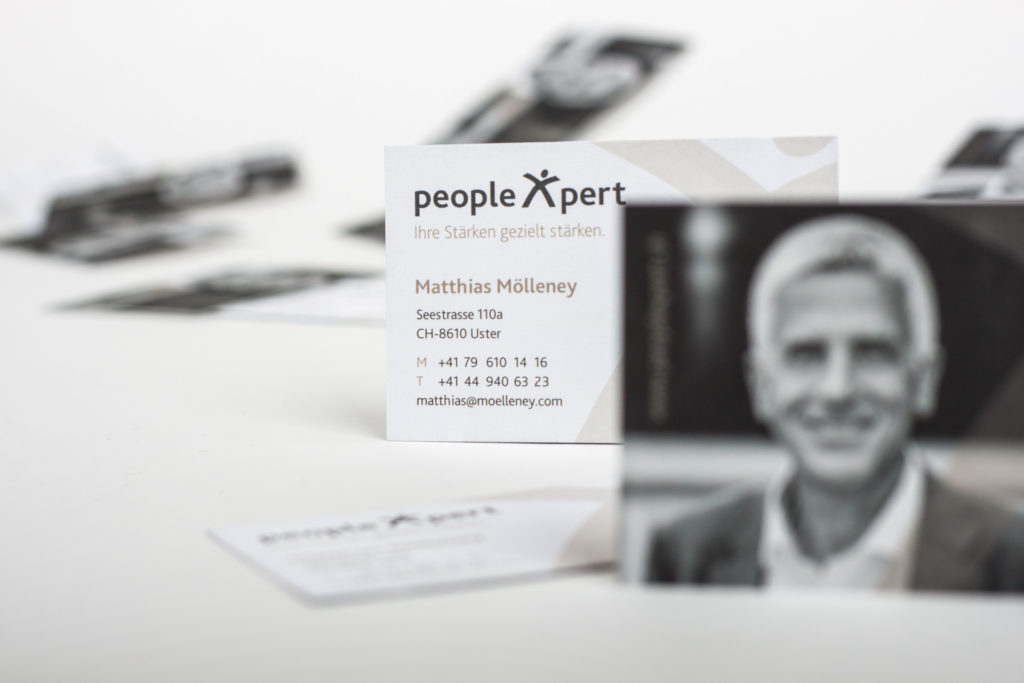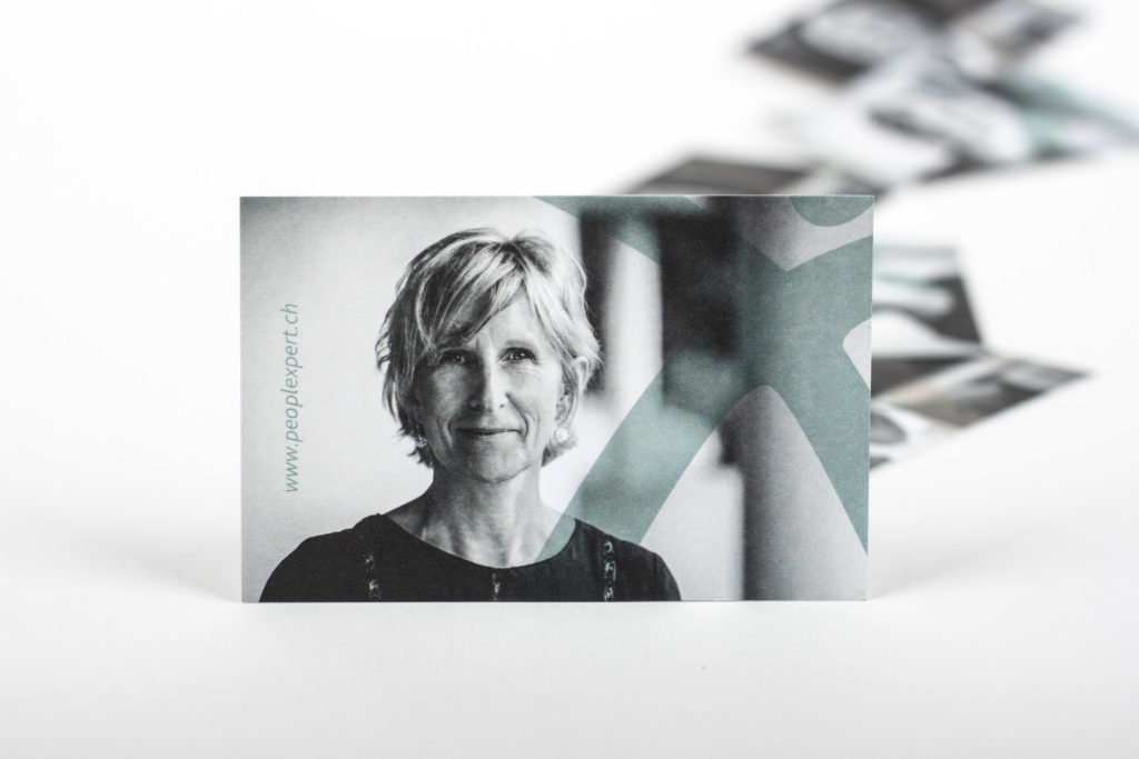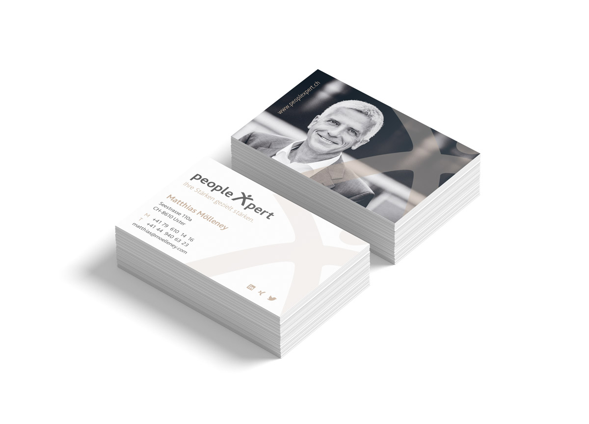 Besondere Aufmerksamkeit galt den Geschäftsdrucksorten. Für Visitenkarten und Unterlagen wurde das hochwertige Papier Munken Pure Rough gewählt – eine Entscheidung, die den hohen Qualitätsanspruch des Kunden unterstreicht. Ergänzend entstand im Zuge des Redesigns ein neuer, prägnanter Claim: «Ihre Stärken gezielt stärken» – ein Versprechen, das die Markenidentität von PeopleXpert treffend auf den Punkt bringt.