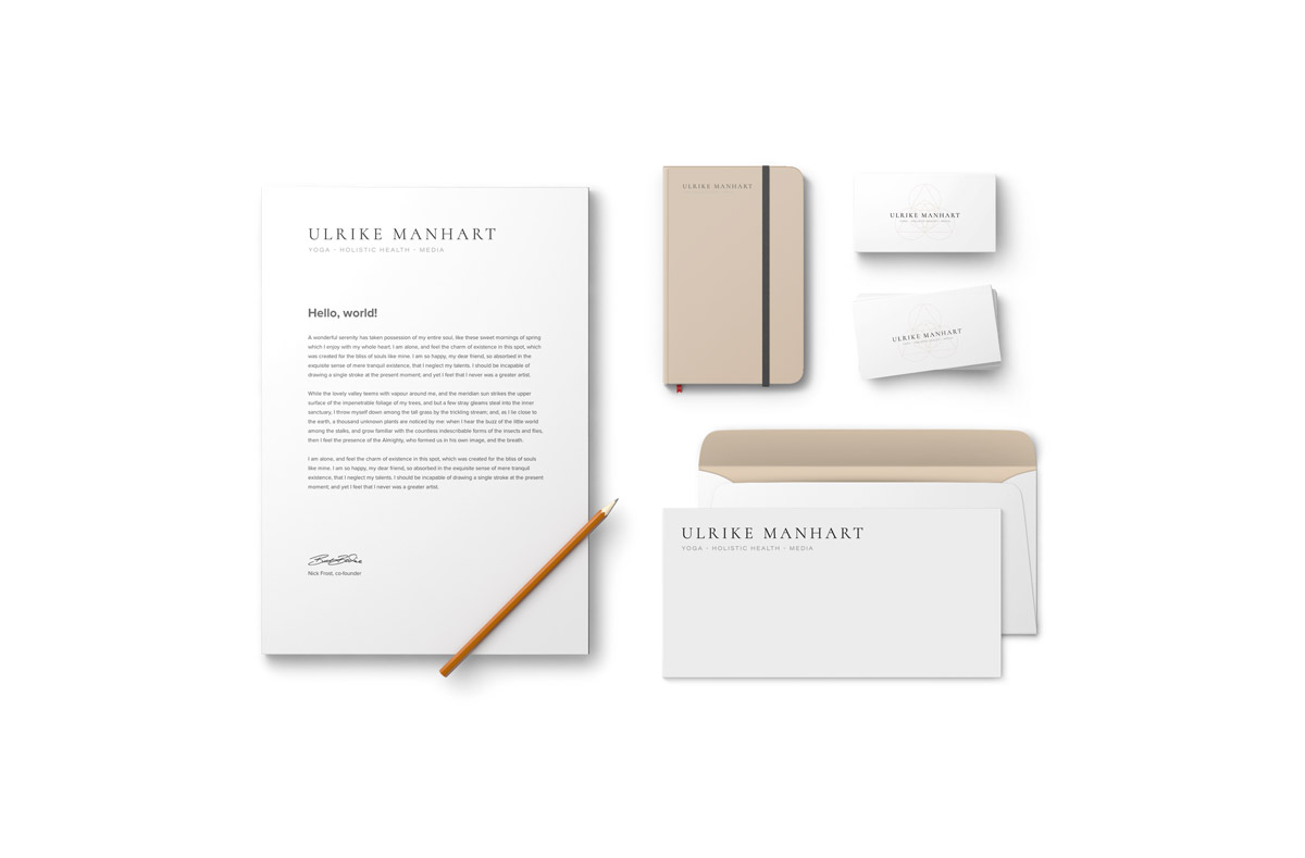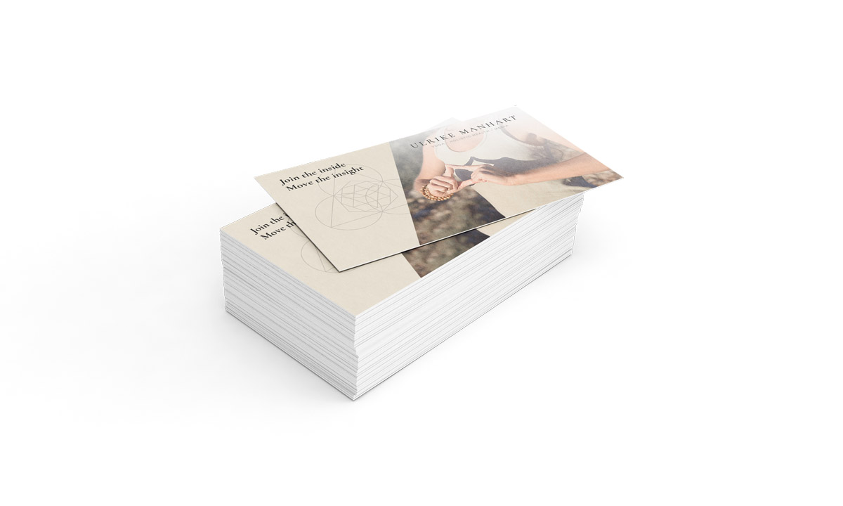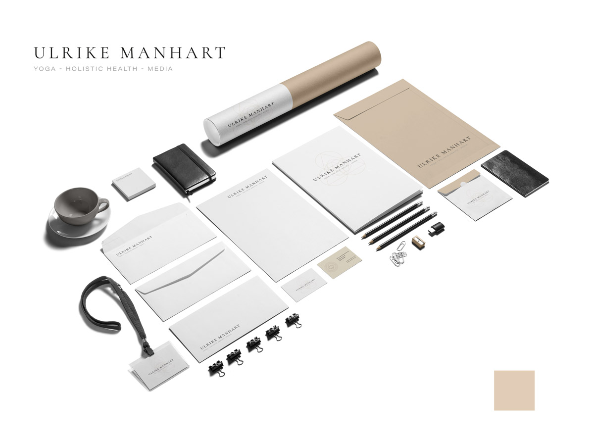 Für die Marke Ulrike Manhart wurden grafische Elemente aus dem Bereich Sacred Geometry integriert, um die Trinität der drei Tätigkeitsfelder Yoga, Holistic Health und Media visuell darzustellen. Die leichten, eleganten Gestaltungselemente ergänzen die Corporate Identity und sorgen für Wiedererkennung in allen Medien. Die Grafiken unterstützen sowohl digitale als auch Printanwendungen und verstärken die visuelle Kohärenz der Marke.